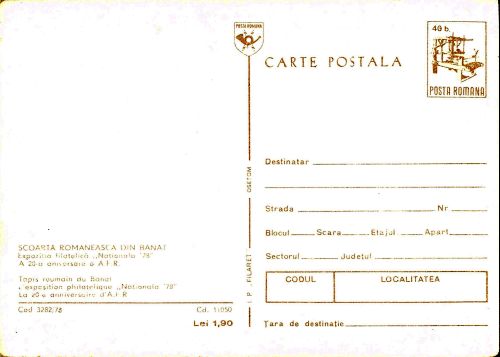 SCOARȚĂ ROMÂNEASCĂ DIN BANAT. EXPOZIȚIA FILATELICĂ ”NAȚIONALA 78”. A 20-A ANIVERSARE A A.F.R.