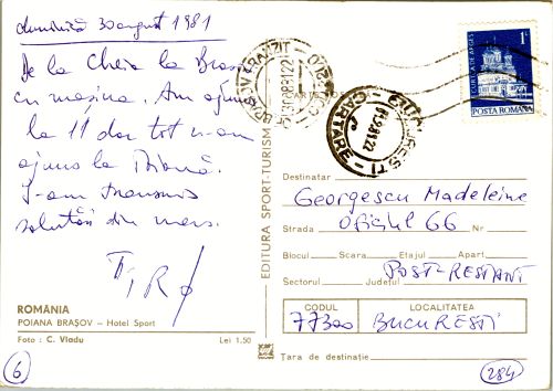 • Descriere: Hotelul „Sport” văzut din partea dreaptă, de pe un mic deal. În centrul imaginii se află Hotelul înconjurat de câțiva brăduți. În partea de jos a imaginii, se văd brândușe înflorite. Hotelul dispune și de o terasă care este aproape complet ocupată de turiști.