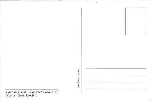 Casa memorială „Constantin Brâncuși” din localitatea Hobița, județul Gorj vedere frontală. În prim planul imaginii se afla un buștean, iar în centru este casa în care a copilărit scuptorul Constantin Brâncuși, formată din trei caremere și pridvor. Aceasta este înconjurartă de un gard de lemn și arbori înalți. În colțul din dreapta, sus este inserat un medalion cu bustul scuptorului.
