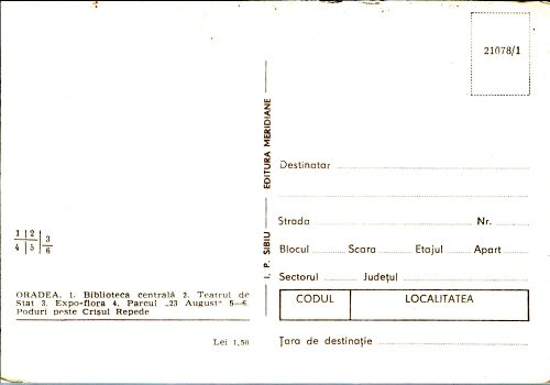 ORADEA. 1. BIBLIOTECA CENTRALĂ. 2. TEATRUL DE STAT. 3. EXPO-FLORA. 4. PARCUL „23 AUGUST”. 5-6. PODURI PESTE CRIȘUL REPEDE
