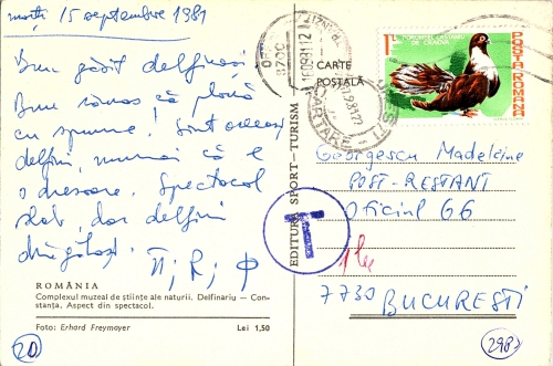 • Descriere: În prim plan, un delfin cooperează cu dresorul său, în timpul unui spectacol la Delfinariul din Constanța.