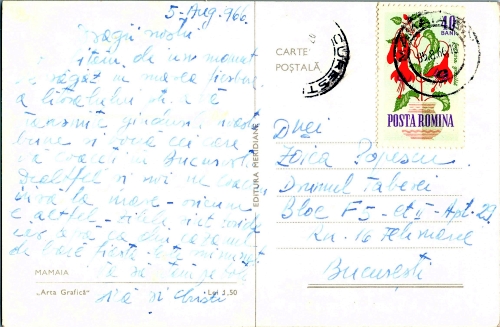 În plan central, în depărtare, hotelurile Aurora, Meridian, Doina, Flora, Victoria din Mamaia. În dreapta, aleea, plaja și marea. În prim plan, o peluză mare.