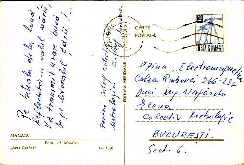 • Descriere: În plan central, hotelurile Parc, Perla, Dacia și Aurora din Mamaia. În prim plan, apa Mării Negre și trei vilegiaturiști pe malul pietros.