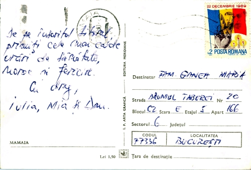 În prim plan, intrarea în Mamaia. În centru, în perspectivă, hotelurile Parc, Aurora, Meridian, Doina, Flora, Victoria și altele în depărtare. În centru dreapta, apa Mării Negre.
