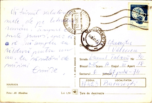 În prim plan, intrarea în Mamaia. În centru, în perspectivă, hotelurile Parc, Aurora, Meridian, Doina, Flora, Victoria și altele în depărtare. În centru dreapta, apa Mării Negre.
