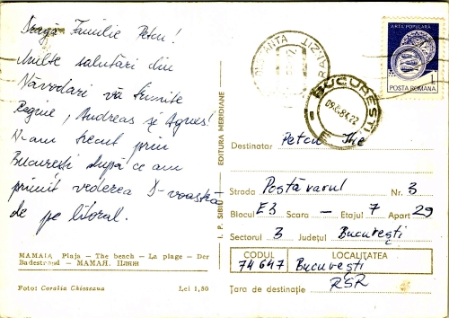 În plan central, plaja din Mamaia, plină de vilegiaturiști stând la soare. În plan secund, în depărtare, hotelurile Aurora, Meridian, Doina, Flora și Victoria. În prim plan, o vilegiaturistă stând pe o placă de beton.