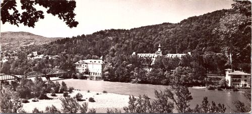 În centru, Oltul la Călimănești. În plan secund, printre copaci, se vede Hotelul Central. În stânga, un pod metalic peste Olt. În fundal, deal împădurit.