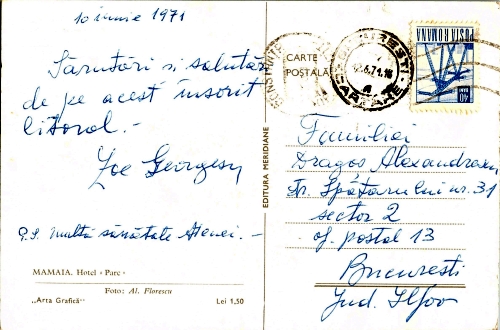 • Descriere: În plan central stânga, Hotelul Parc din Mamaia, iar mai departe, Hotelul Perla. În fața hotelului, plaja plină de vilegiaturiști. În prim plan, apa Mării Negre, cu vilegiaturiști făcând baie.