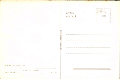 • Descriere: În plan central stânga, Hotelul Parc, Hotel Perla, Hotel Dacia și alte hoteluri din Mamaia. În fața lor, plaja plină de vilegiaturiști. În prim plan, apa Mării Negre.