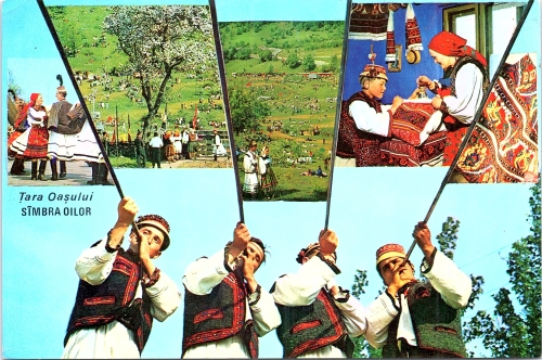 Colaj de fotografii cu persoane în port popular și peisaje din natură. În sensul acelor de ceasornic, în prima fotografie se află câțiva tineri care dansează. În a doua fotografie, în prim plan, sunt câteva persoane în interiorul unei curți. În plan secundar sunt multe persoane pe un deal înverzit. A treia fotografie are în prim plan un cuplu îmbrăcat în costum popular, și în depărtare mai multe persoane prezente la festival, pe un deal înverzit. A patra fotografie ilustrează interiorul unei case în care o femeie în costum popular îi arată unui copil tainele cusutului. În partea de jos a colajului sunt patru tineri în costum popular.