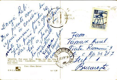 • Descriere: În centru, Podul Sfântul Ladislau peste Crișul Repede din Oradea. Pe pod, trecători. În plan secund dreapta, un colț al Casei Lévay. În prim plan, rond de flori.