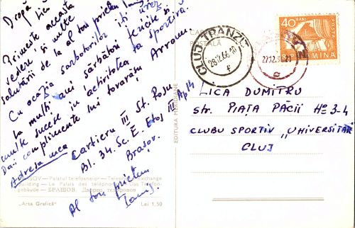 Imagine cu palatul telefoanelor din Brașov. În prim plan se află o zonă verde, cu flori înalte. În plan îndepărtat se află clădirea, văzută din lateral.