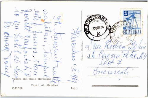 O stradă centrală din Băile Herculane, mărginită de un hotel și de copaci. În plan central, trecători.