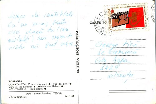În prim plan, un dig din portul Constanța. În plan secund, nave comerciale acostate și macarale portuare. În plan îndepărtat, Marea Neagră.