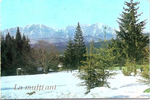 Panoramă asupra Munților Bucegi văzuți din stațiunea Predeal. Peisajul este unul de iarnă. Felicitarea conține pe copertă următoarea urare: "La mulți ani!"