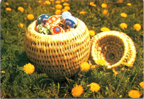 Vedere pentru sărbătorile pascale. În centrul imaginii sunt două coșulețe, unul dintre acestea este plin cu ouă încondeiate de diferite culori. Aceste coșuri sunt așezate pe o pajiște verde cu păpădii.