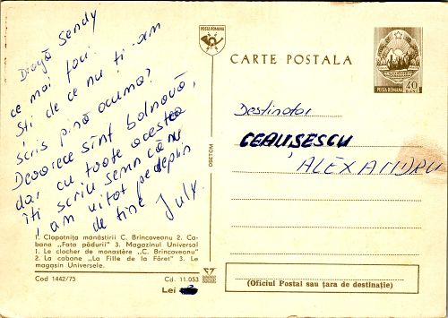 • Descriere: Colaj cu trei fotografii. În stânga, ocupând o jumătate din cartea poștală este clopotnița Mănăstirii Constantin Brâncoveanu, monument istoric din Stațiunea Climaterică Sâmbăta. În dreapta, sus este cabana \„Fata pădurii\”, astăzi ruină. În dreapta jos, magazinul universal din Orașul Victoria.