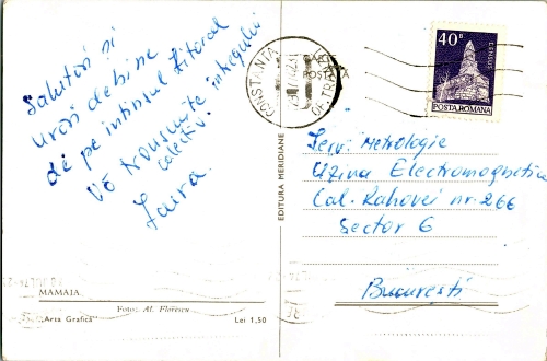 • Descriere: În plan central stânga, Hotelul Parc din Mamaia, iar mai departe, alte hoteluri. În fața lor, plaja plină de vilegiaturiști. În prim plan, flori și apa Mării Negre, cu vilegiaturiști făcând baie.