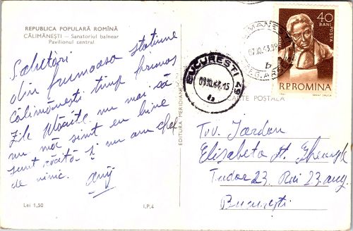• Descriere: În centru, Hotelul „Central” din Călimănești, văzut din lateral. În plan secund, deal împădurit. În prim plan, rond de flori și lac artificial.