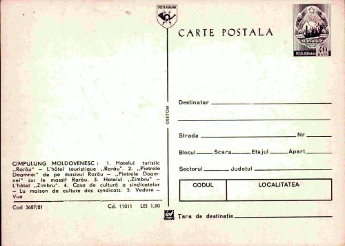CÎMPULUNG MOLDOVENESC: 1. HOTELUL TURISTIC „RARĂU”. 2. „PIETRELE DOAMNEI” DE PE MASIVUL RARĂU. 3. HOTELUL „ZIMBRU”. 4. CASA DE CULTURĂ A SINDICATELOR. 5. VEDERE.