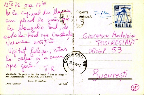 • Descriere: Plaja din Mamaia, plină de vilegiaturiști stând la soare. În plan secund dreapta, apa Mării Negre.