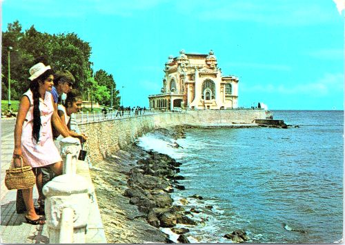 • Descriere: În plan secund centru, Cazinoul din Constanța, văzut din semiprofil. În prim plan, aleea de pe faleză și trecători admirând marea. În dreapta, apa Mării Negre.