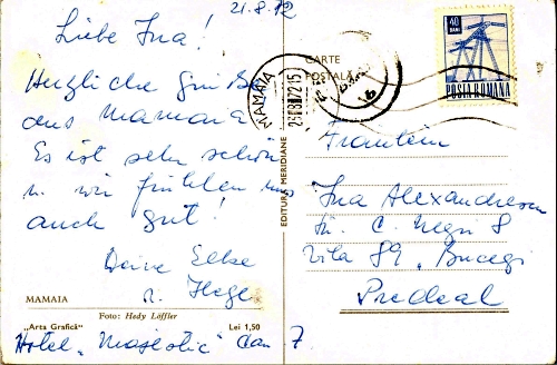 • Descriere: În prim plan, imagine de sus a Moscheei din Mamaia, cu minaretul în dreapta. În fața ei, un mic parc. În plan secund, plaja plină de vilegiaturiști și Marea Neagră.