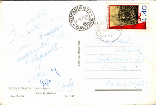 • Descriere: În centru se află Hotelul Sport fotografiat iarna. În curtea hotelului se pot vedea câțiva turiști care se plimbă,iar unul dintre ei se îndreaptă pe schiuri către hotel. În planul secundar se vede o parte din pădurea din spatele hotelului.