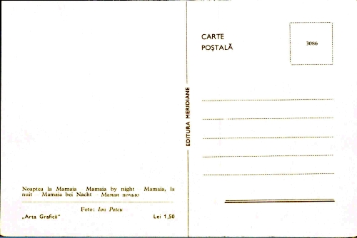 • Descriere: În plan central, hotelul Parc din Mamaia (și alte hoteluri în perspectivă), văzut de pe malul Mării Negre, noaptea. În prim plan, apa mării reflectând luminile Mamaiei și doi vilegiaturiști pe mal.
