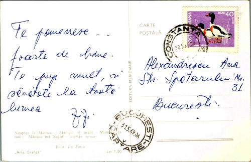 • Descriere: În plan central, hotelul Parc din Mamaia (și alte hoteluri în perspectivă), văzut de pe malul Mării Negre, noaptea. În prim plan, apa mării reflectând luminile Mamaiei și doi vilegiaturiști pe mal.