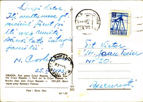 • Descriere: Oradea: În centru dreapta, Podul Sfântul Ladislau peste Crișul Repede. În plan secund dreapta, Casa Lévay. Pe pod, trecători. În centru, în depărtare, fațada Teatrului de Stat. În prim plan, parcare pe malul râului.