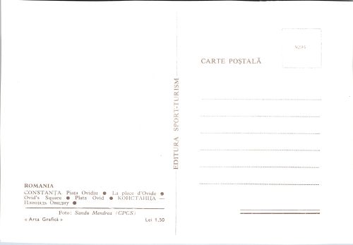 Aspect al pieții Ovidiu din Constanța. În centru statuia poetului Ovidiu, pe lângă care sunt parcate mașini și un autobuz. Pe fundal se disting blocuri și silueta Marii Moschei din Constanța, înconjurată de vegetație.
