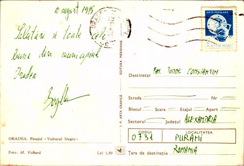• Descriere: În centru, celebrul palat „Vulturul Negru” din Oradea și mulți orădeni în fața sa. În prim plan, rondul de flori din Piața Unirii.