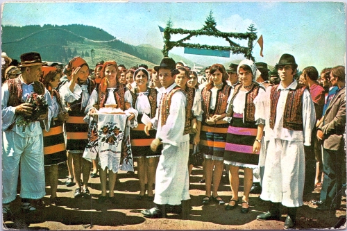 Grup de persoane în costum popular în fața unui peisaj montan. O fată din primul rând ține în mâini o tavă cu pâine. În spatele grupului se observă o arcadă decorată pentru primirea invitaților.