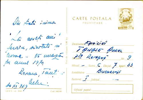 Felicitare dedicată sărbătorilor de iarnă. Imaginea surprinde un grup de colindători în momentul dansului tradițional al caprei, tradiție românească specifică Anului Nou.