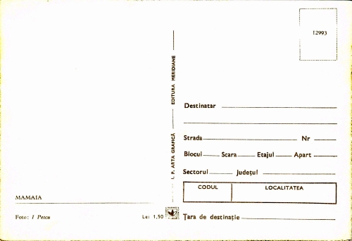 • Descriere: În plan îndepărtat, hotelul Parc din Mamaia și alte hoteluri, văzute de pe malul Mării Negre, pe înserat. În prim plan, apa mării, plaja și mal pietros.