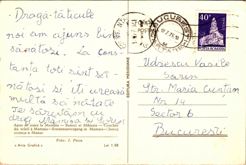 În plan central, hotelul Parc din Mamaia, văzut de pe malul Mării Negre, pe înserat. În prim plan, apa mării și doi vilegiaturiști.