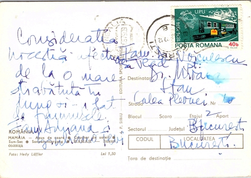 Plaja din Mamaia, pe înserat. În plan central, Hotelul Dacia mărginit de copaci, iar în depărtare. Hotelul Perla. În prim plan, plaja și apa mării reflectând soarele apunând.