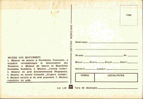• Descriere: Colaj de șapte imagini cu muzee din București. În prima imagine se redă palatul care găzduiește Muzeul Național al Țăranului Român, văzut dinspre bulevardul Pavel D. Kiseleff. În a doua imagine este surprins Palatul Poștelor, actual sediu al Muzeului Național de Istorie a României, văzut dinspre nord-est, din curtea Casei de Economii și Consemnațiuni. A treia imagine redă o parte din palatul voievodal ruinat Curtea Veche, așa cum se vede din strada Franceză. În plan îndepărtat se vede o clădire înaltă de pe strada Covaci. În a patra imagine este fotografiat dinspre vest, de pe lacul Mogoșoaia. Se observă fațada din cărămidă pe care se remarcă logia de influență venețiană. Apa lacului este albastră și pe alocuri este acoperită cu papura. În fotografia cinci se redata clădirea Muzeului de Istorie Naturală, văzută dinspre est, din Piața Victoriei. În a șasea fotografie este prezentată o poartă maramureșană din lemn în jurul căreia se află un frup de tineri îmbrăcați în port popular. În fundal se vede o casă cu etaj din lemn, ridicată în stilul arhitecturii vernaculare. În ultima fotografie este redat palatul Romanit, clădire cu două corpuri ce fac un unghi drept, având amândouă câte două etaje. Fotografia este făcută de pe bulevardul Calea Victoriei.