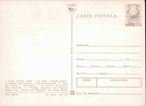 CÎMPULUNG MOLDOVENESC: 1. LICEUL DRAGOȘ VODĂ. 2. VEDERE PANORAMICĂ. 3. CASA DE CULTURĂ A SINDICATELOR. 4. PIETRELE DOAMNEI DIN MASIVUL RARĂU.
