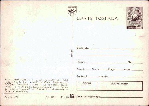 JUD. MARAMUREȘ: 1. LACUL „IEZERUL” DIN VÂRFUL „PIETROSUL”. 2. BORȘA: COMPLEXUL TURISTIC. 3. STAȚIUNEA DE ODIHNĂ „IZVOARELE”. 4. POARTĂ DIN MARAMUREȘ.
