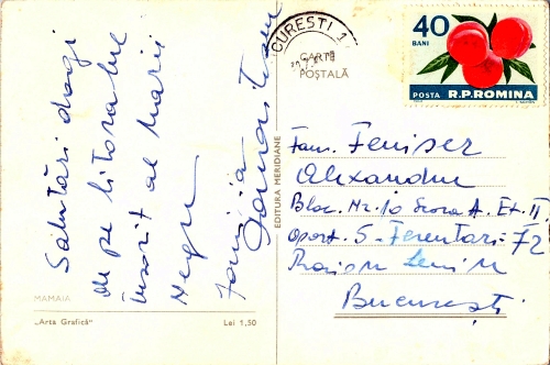În plan central, hotelurile Meridian, Doina, Flora, Victoria din Mamaia. În prim plan, un copăcel și plaja cu tufișuri și câțiva vilegiaturiști.