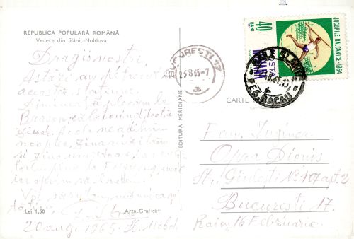 Vedere panoramică cu centrul stațiunii Slănic Moldova la începutul anilor ‘50. Fotografia pare a fi făcută dinspre platoul de sub vârful Cerbu și cuprinde insulele de locuire situate de-o parte și de alta a străzilor Nicolae Bălcescu și Vasile Alecsandri, între Complexul Balnear „Emil Racoviță” și fosta primărie din Slănic. În planul apropiat este clădirea sanatoriului - Complexul Balnear Racoviță. Central sunt clădiri diverse și Cazinoul, iar în plan îndepărtat, poalele împădurite ale munților Nemira.