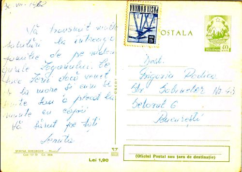 • Observații: Cartea poștală este completată și timbrată, dar lipsește ștampila poștei, ceea ce înseamnă că nu s-a expediat prin sistemul poștal.