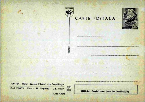 • Descriere: În centru, Hotelul Scoica din Jupiter. În prim plan, lacul artificial din fața hotelului.