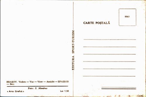 Vedere de sus a Pieței Sfatului. Se pot observa clădirile, dintre care putem observa Casa Sfatului, iar in mijlocul pieței o mulțime de persoane și autoturisme. În depărtare se pot vedea clădirile mai noi ale orașului și un versant împădurit.
