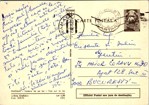• Descriere: În plan central, o barcă cu pânze plină cu vilegiaturiști, pe Lacul Siutghiol din Mamaia. În plan secund, malul lacului și două hoteluri.