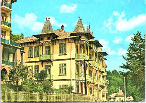Aspect lateral al fațadei vilei Căprioara din Slănic-Moldova. se remarcă decorația fațadei cu balcoanele din lemn cu coloane. În partea stângă se distinge un colț al vilei Pallas. În depărtare, în dreapta, silueta vilei Pufu.