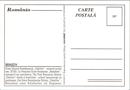 • Descriere: Imagine cu clădirea primei Scoli românești din Brașov. Pe centrul fotografiei se află clădirea văzută frontal, îar în colțul din dreapta, jos, se află o imagine cu o pagină din „Omiliar”, primul manual școlar.