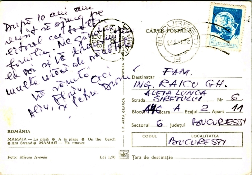 • Descriere: Plaja din Mamaia, cu vilegiaturiști făcând baia și copii jucându-se în nisip. În depărtare, un dig.